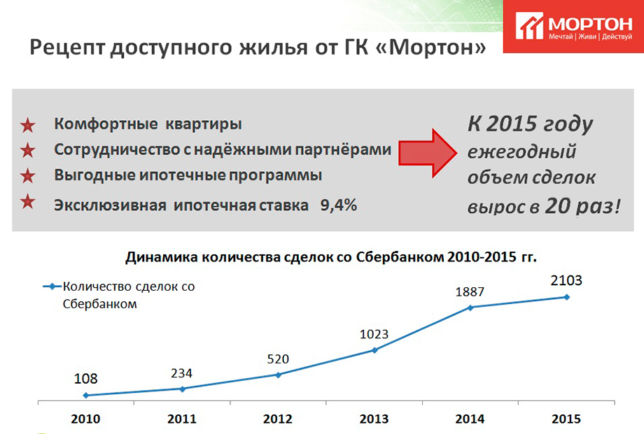 Также вице-президент компании представил доклад об истории успеха ГК «Мортон» на панельной сессии для застройщиков. Олег Колченко отметил, что за два десятилетия успешной работы компания прошла огромный путь от подрядной организации до крупнейшего застройщика страны, ежегодно сдающего миллион квадратных метров комфортабельного жилья и десятки объектов социальной инфраструктуры. Он особо подчеркнул значительную роль партнеров компании в ее становлении и развитии. И ключевым партнером сегодня выступает именно Сбербанк. Крупнейший российский банк и ГК «Мортон» начали сотрудничать по ипотеке в 2010 году, и за 5 лет эффективной работы объем проведенных ипотечных сделок вырос в 20 раз. В прошлом году только по ипотеке от Сбербанка было оформлено 46% ипотечных сделок ГК «Мортон», и благодаря совместным программам с максимально выгодными условиями покупки жилья более 2 100 семей стали обладателями современных квартир в самых благоустроенных микрорайонах столичного региона. Такие высокие показатели позволили компании второй год подряд стать «Платиновым Партнером» ведущего банка России.