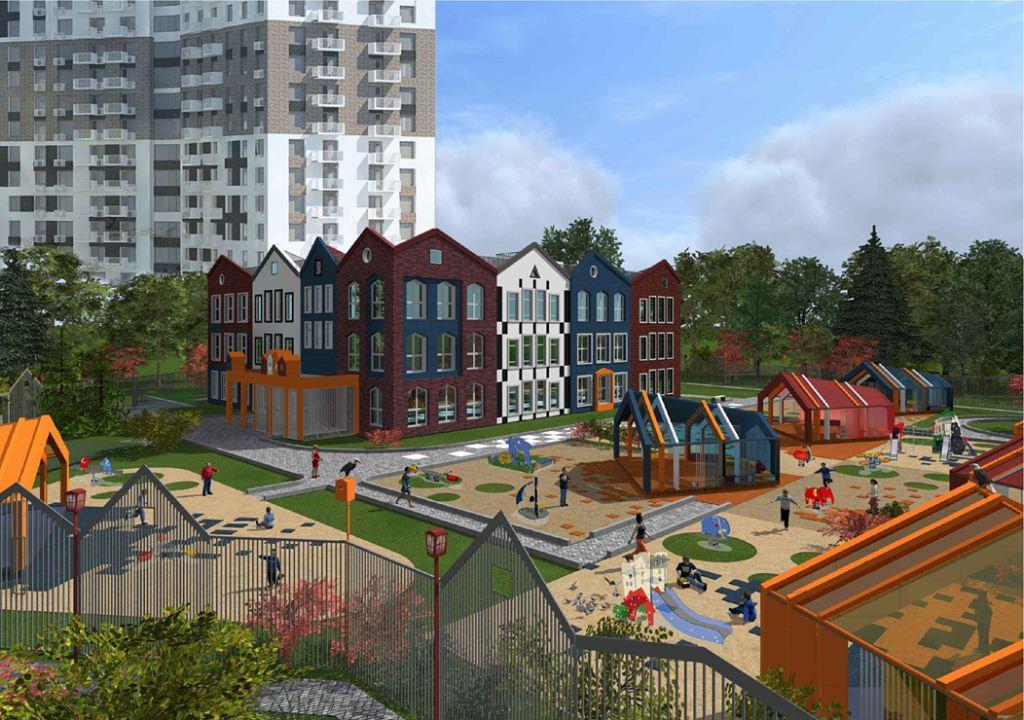 Трехэтажный садик на 200 малышей будет возведен в первой очереди проекта, строительство которой уже началось, и будет сдан одновременно с окончанием строительства первых жилых домов. Общая площадь здания составляет порядка 3,6 тыс. кв.м, все его помещения адаптированы для маломобильных жителей.