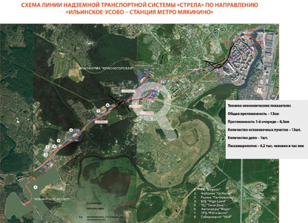 Надземная транспортная система «Стрела» на основе немецкой технологии H-Bahn представляет собой внеуличный транспортный комплекс, который с минимальными затратами интегрируется в существующую транспортную сеть. Его основные преимущества – высокое качество транспортных услуг, разумная стоимость проезда, (порядка 45 рублей), высокая скорость доставки пассажиров – до 60-80 км/ч; высокая степень транспортной безопасности, а также максимально низкий уровень воздействия на окружающую среду. Двигаясь на высоте от 4,5 м над уровнем земли, транспортная система не создает помех движению автомобильного транспорта, и при этом двигается в безсветофорном режиме, с точностью прибытия на остановочные пункты до нескольких секунд. Городские районы с плотной застройкой преодолеваются без сноса, трассы не занимают улиц, а пассажирские станции легко интегрируются в существующие и вновь строящиеся здания – остановки малошумного транспорта могут быть интегрированы в ТРЦ.