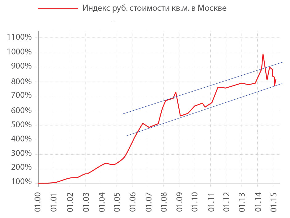 График 1. Индекс рублевой стоимости кв.м жилья в Москве в 2000-15 гг.