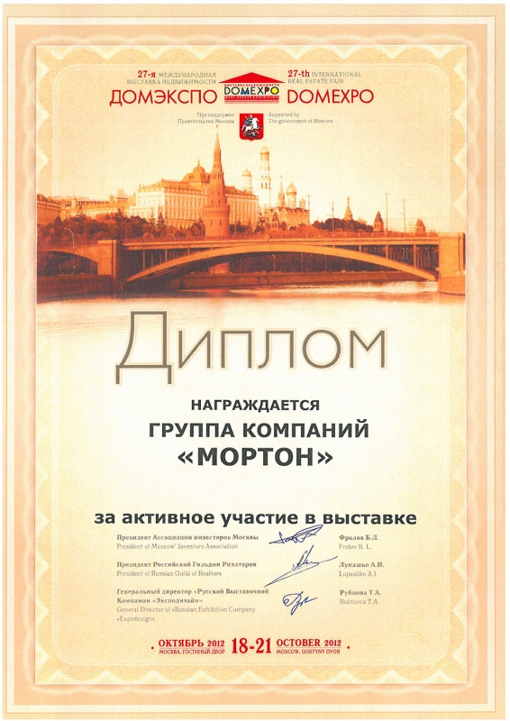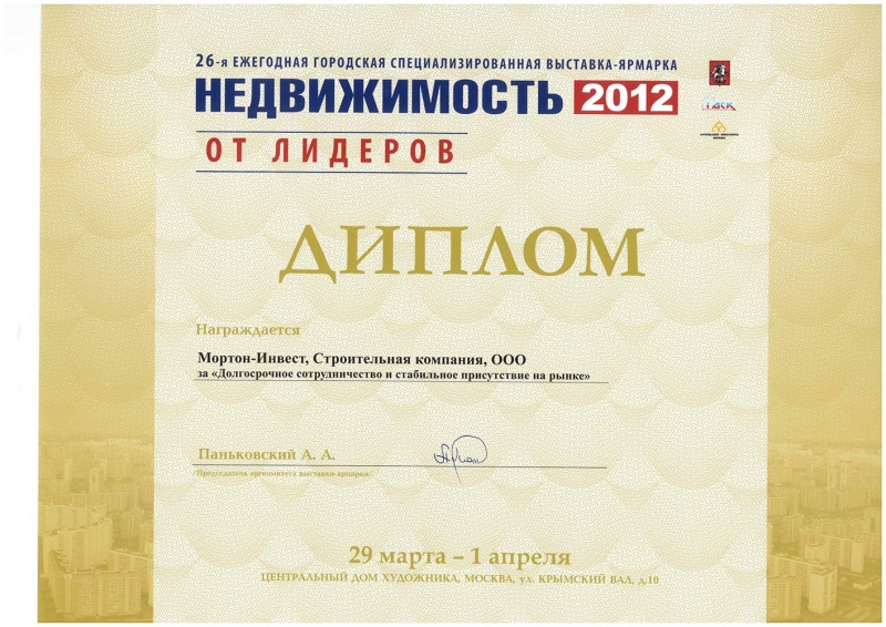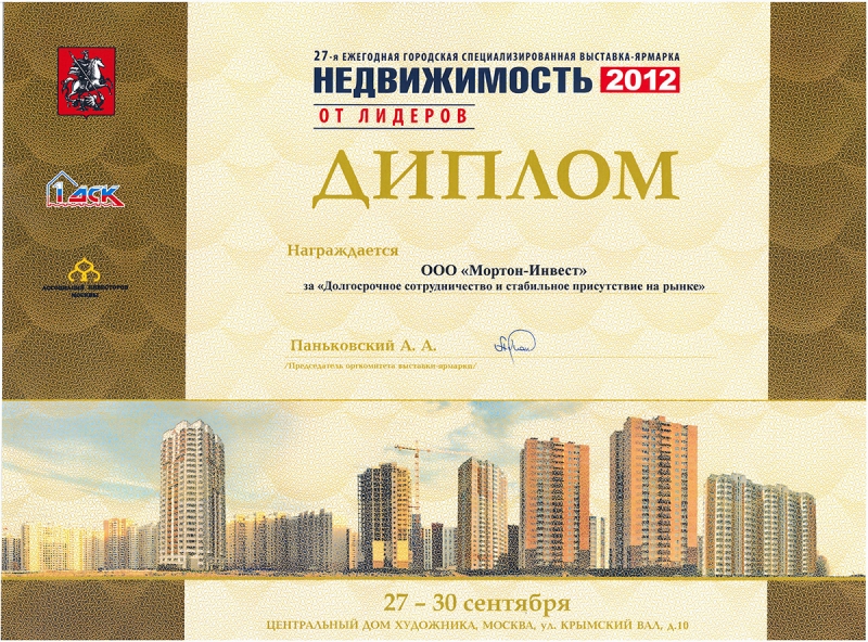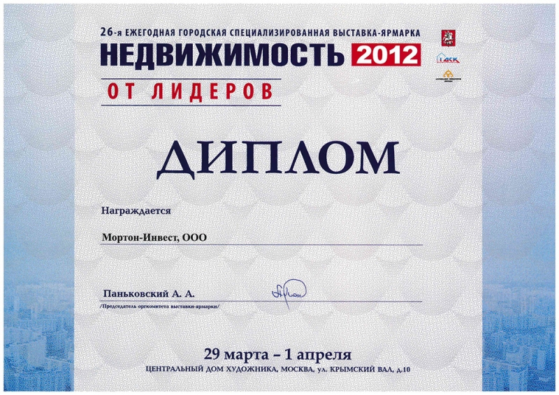 Диплом 26-й ежегодной городской специализированной выставки-ярмарки «Недвижимость 2012»