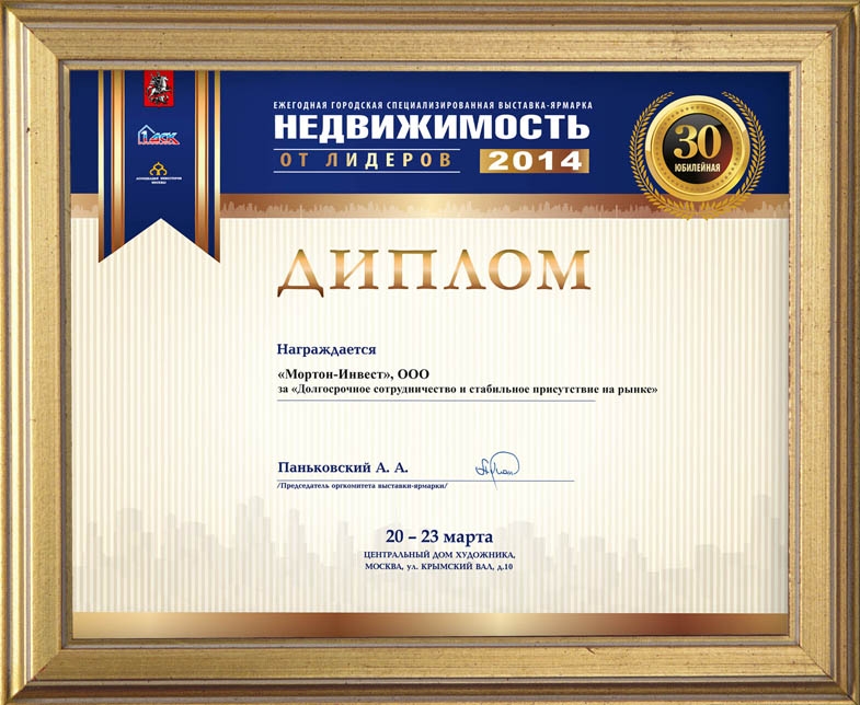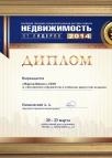 Диплом 30-й ежегодной городской специализированной выставки-ярмарки «Недвижимость 2014» за «Долгосрочное сотрудничество и стабильное присутствие на рынке»