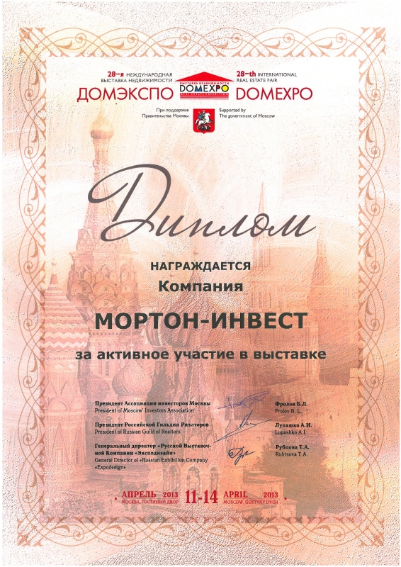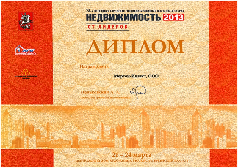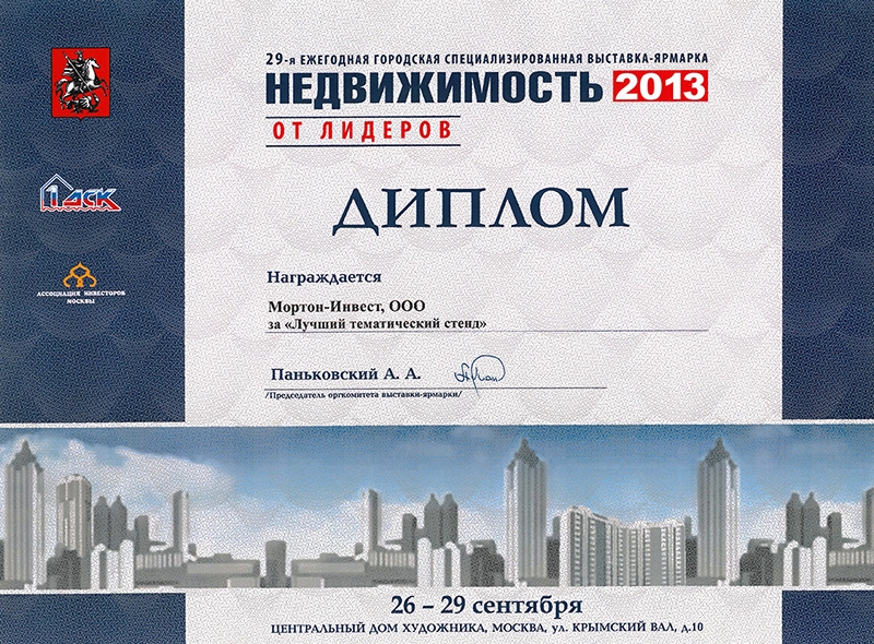 Диплом за лучший тематический стенд на 29-й ежегодной городской специализированной выставке-ярмарке «Недвижимость 2013»