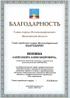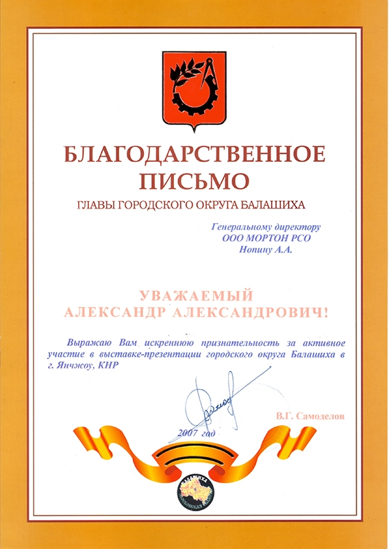 Благодарственное письмо от за активное участие в выставке-презентации городского округа Балашиха в г. Янчжоу, КНР.