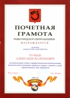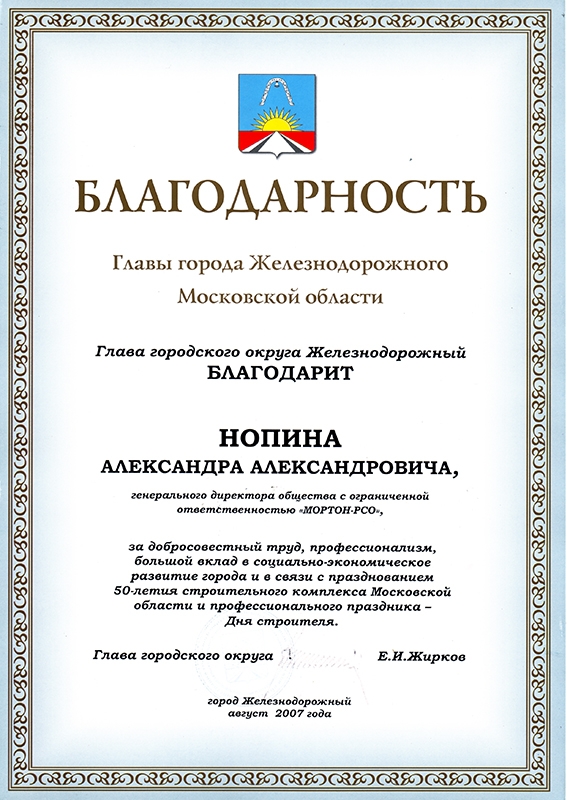 Почетная грамота за достигнутые успехи в профессиональной деятельности, большой вклад в развитие городского округа, а также в связи с празднованием Дня строителя.