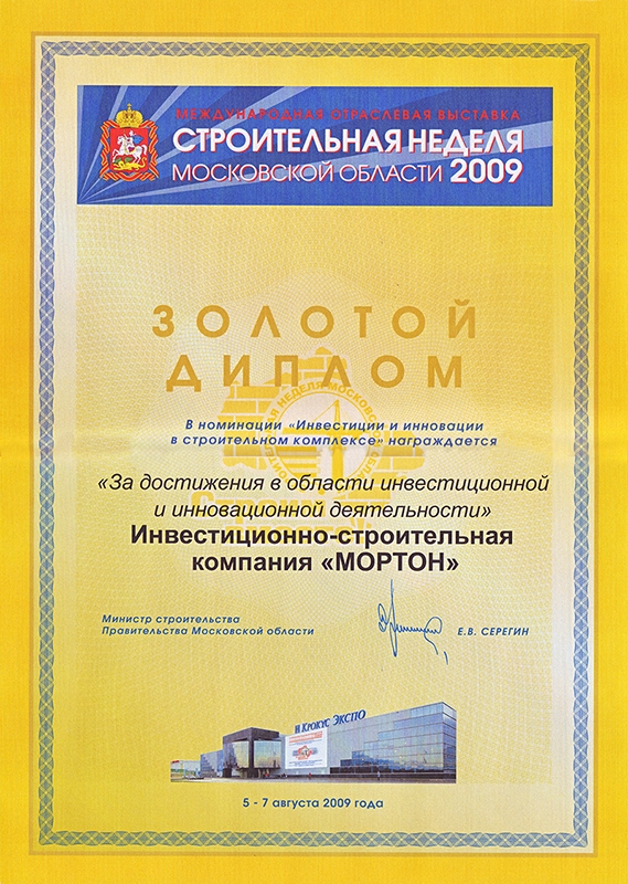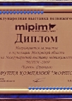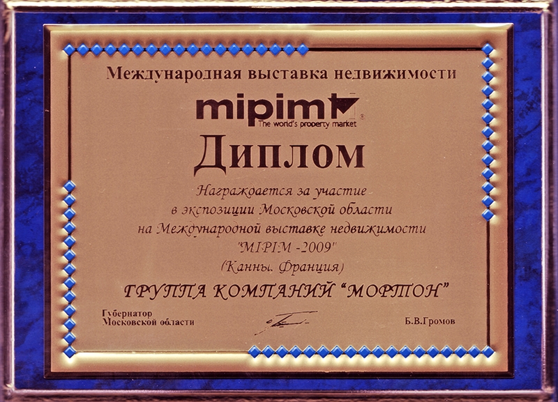 Диплом за участие в экспозиции Московской области на Международной выставке недвижимости «MIPIM-2009» (Канны. Франция).