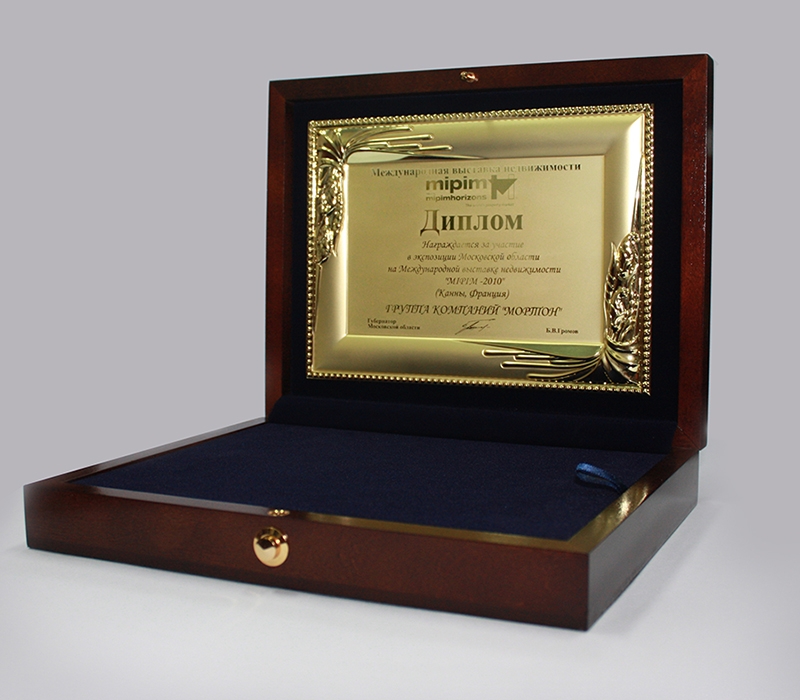 Диплом за участие в экспозиции Московской области на Международной выставке недвижимости «MIPIM-2010» (Канны, Франция).