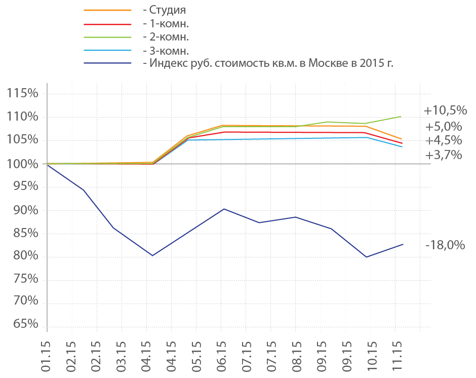 График 1. Индекс рублевой стоимости кв.м жилья в Москве в 2000-15 гг.